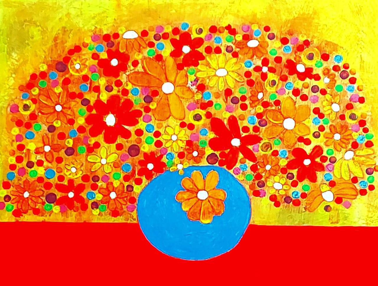 Artworks express sunny vibrant colors and mosaic cubism techniques .